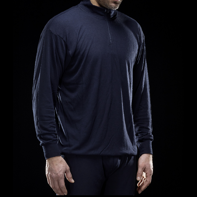 Maglia ignifugo antistatica con polsini elasticizzati, collo a lupetto, chiuso da cerniera e coperta da pattella interna ed esterna alla zip.