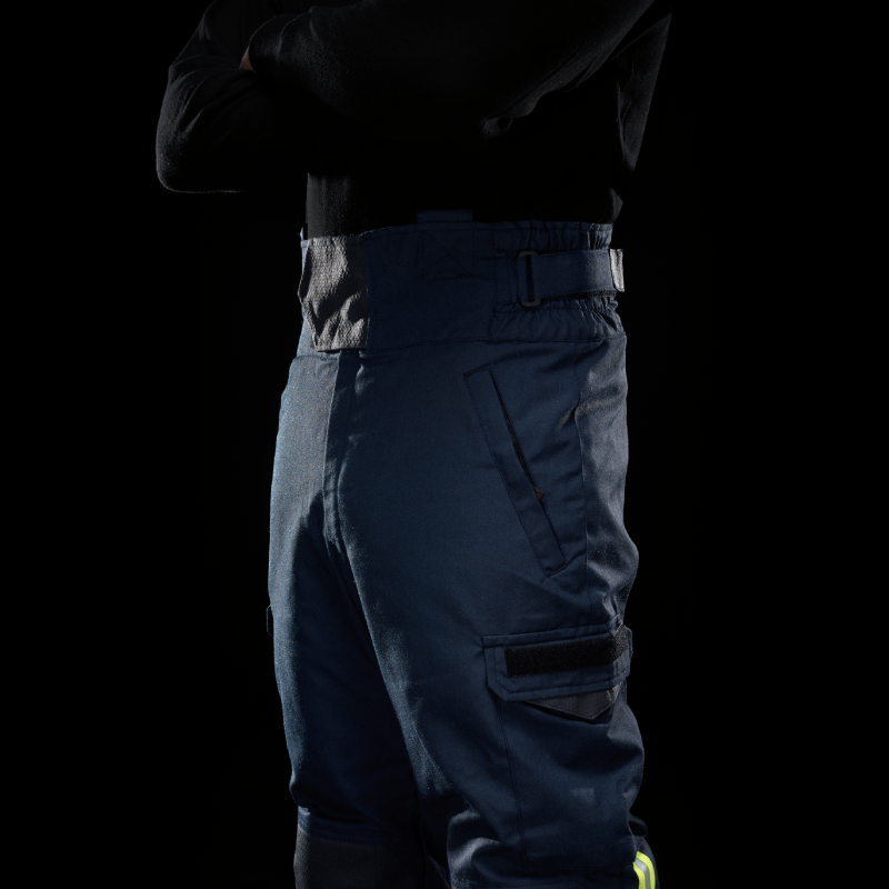 Pantalone Vigili del Fuoco, in Nomex® Outershall Tough color blu con bande rifrangenti a microsfere bicolori giallo/argento su polpaccio.